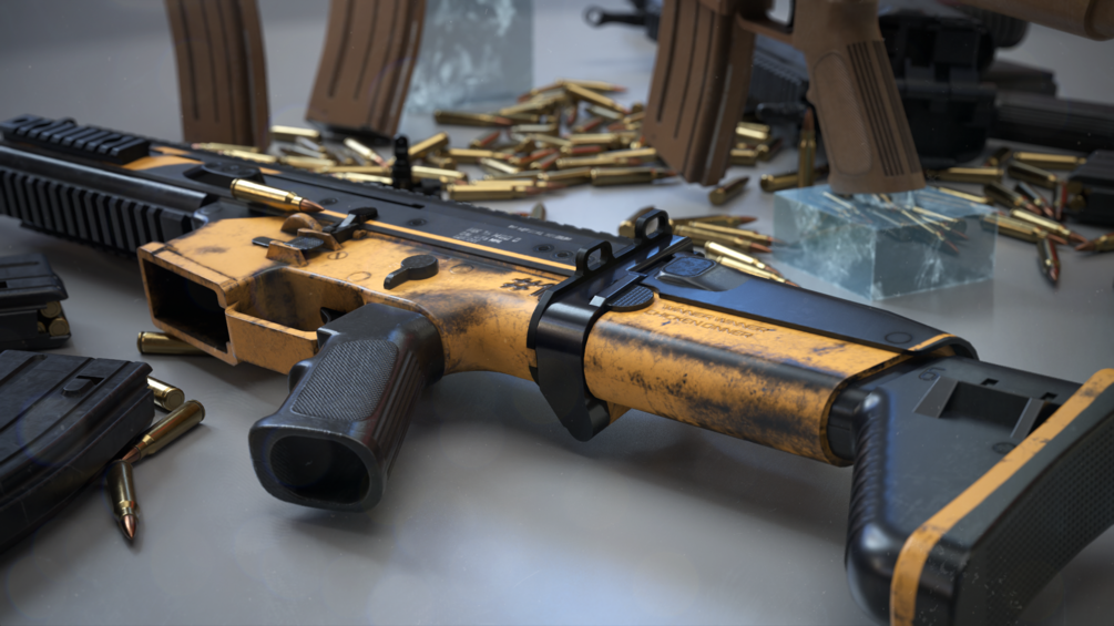The model has one 4K texture set which presented in a slightly worn condition. Best suited for use in first-person fps games or renders, but you can use it in your other projects as well. Polycount is equal to current generation games. Material, meshes and textures names follow an easy to understand naming convention. The structure of the model allows you to create the following animations: shooting, reloading, switching the fire mode, folding the butt or increasing its length. The native blender file has drivers to help you animate the model. You can also add your custom scope, grip or whatever.